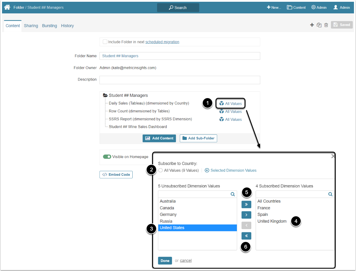 - Subscribe to: Select either to add "All Values" to the Folder or only the "Selected Dimension Values"