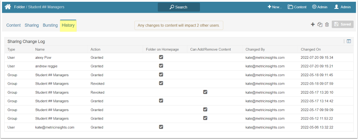 When Group or User is removed from the Sharing tab, the log entry about it appears in the Sharing Change Log table with the "Revoked" record in the Action column. The check mark in the Folder on Homepage or Can Add/Remove Content columns appears if the corresponding User or Group Permission was declined. If the User or Group loses both Permissions, two separate log entries are added.