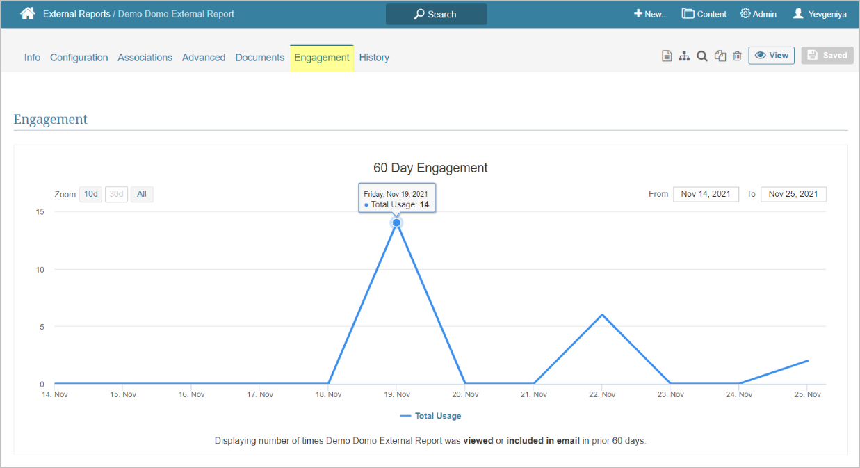 The chart shows total Engagement with the element from all users in the system within the last 60 days. Engagement = Views from Element Viewers on desktop + Views from Element Viewers on MI mobile apps + number of times this Element has been distributed.