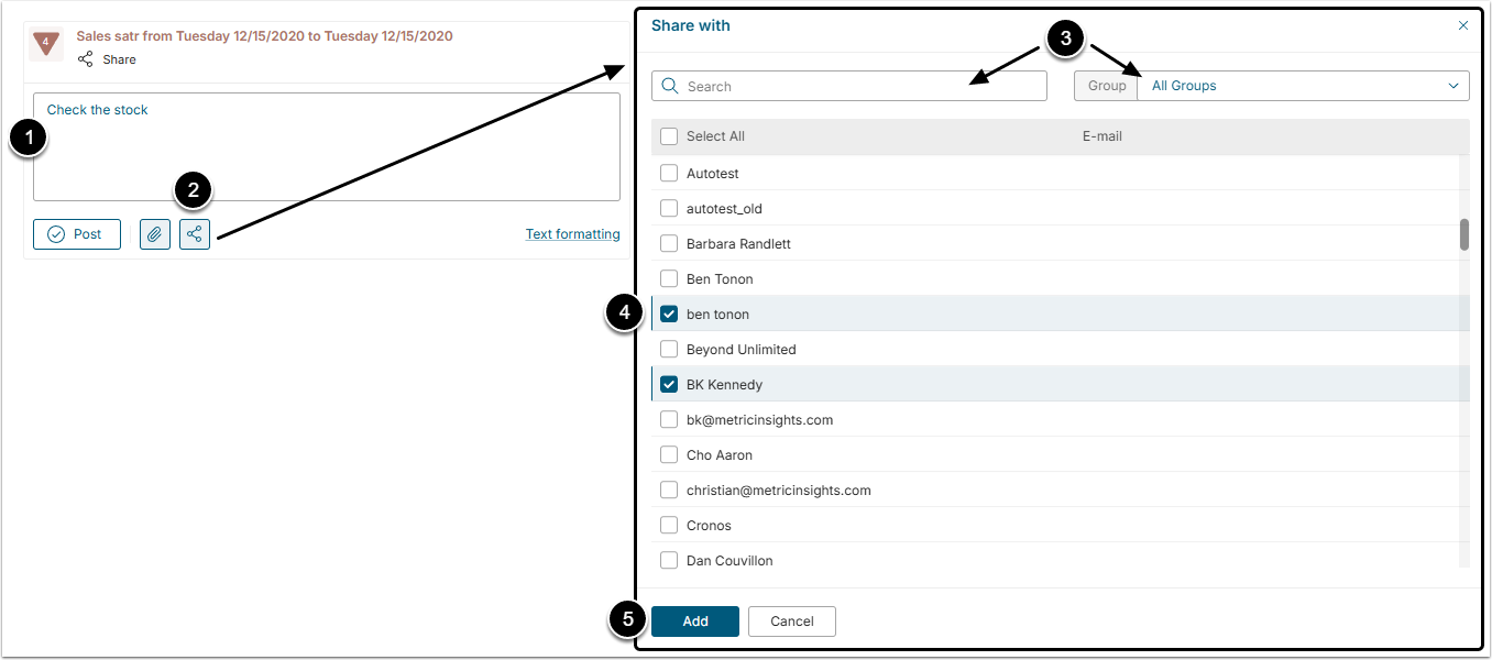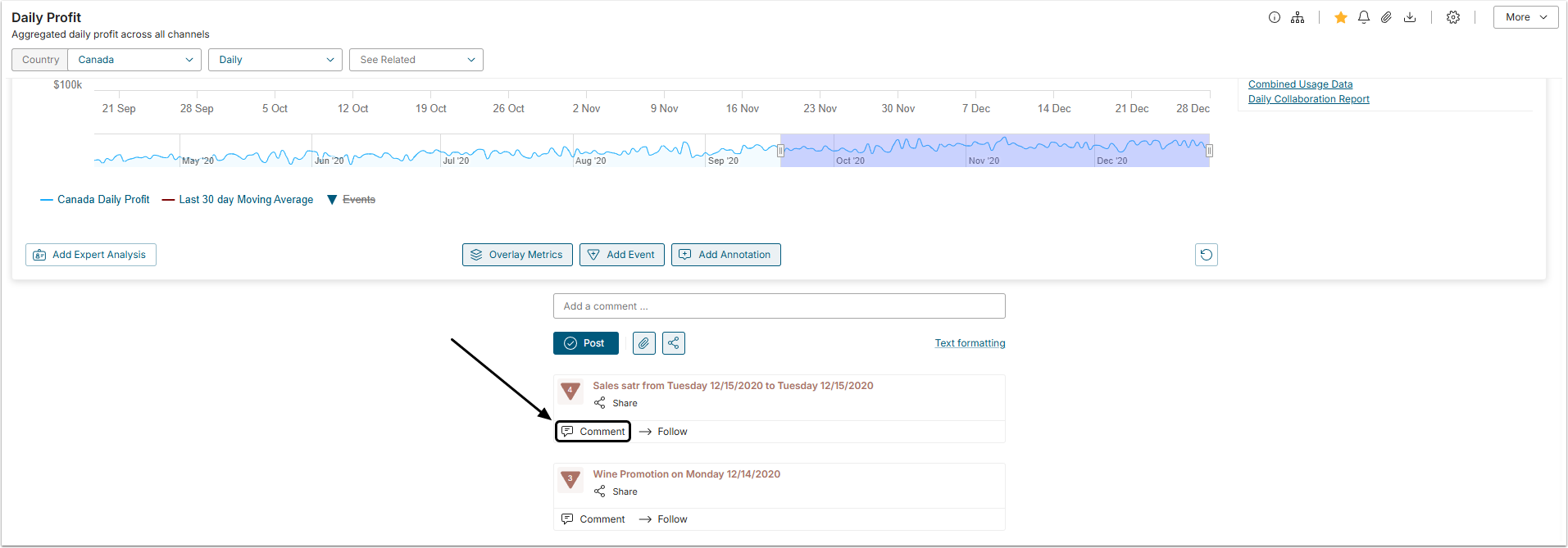 Metric Insights provides a convenient means to share collaboration items and associated information with other MI Users. The example below uses sharing a Comment, but the sharing functionality works in the same way for sharing other types of annotations, such as Alerts or Events.
