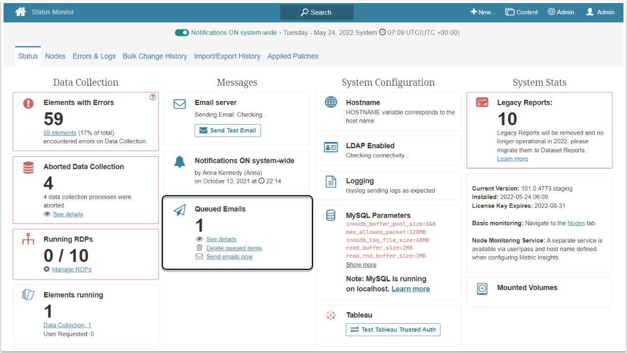 To check if there are some messages in the queue, access Admin > Status Monitor and review the Queued Emails section.