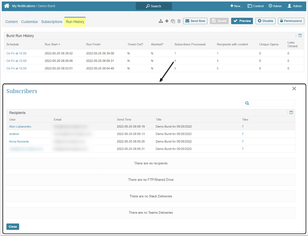Clicking the "Subscribers Processed" or "Recipients with content" value active link opens the Subscribers screen. The Recipients grid displays how many tiles were in the Burst that the User received. If the Burst failed for one of the Users, instead of the tiles number, an error description is displayed.