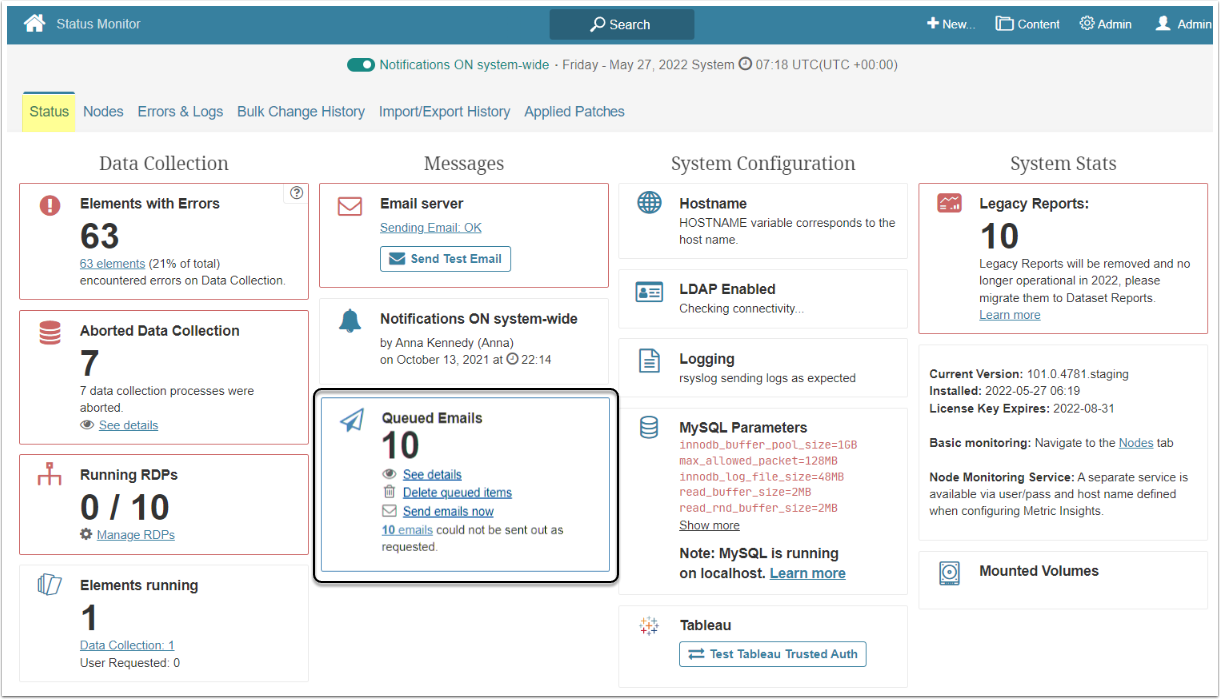 On the Status tab, in the Queued Emails section, the queue and any messages that were not sent are displayed.