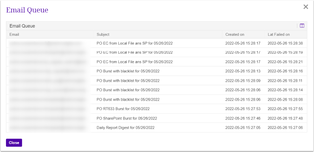Clicking on the email link of those not sent opens an Email Queue window where you can see the time that the Burst distribution failed.