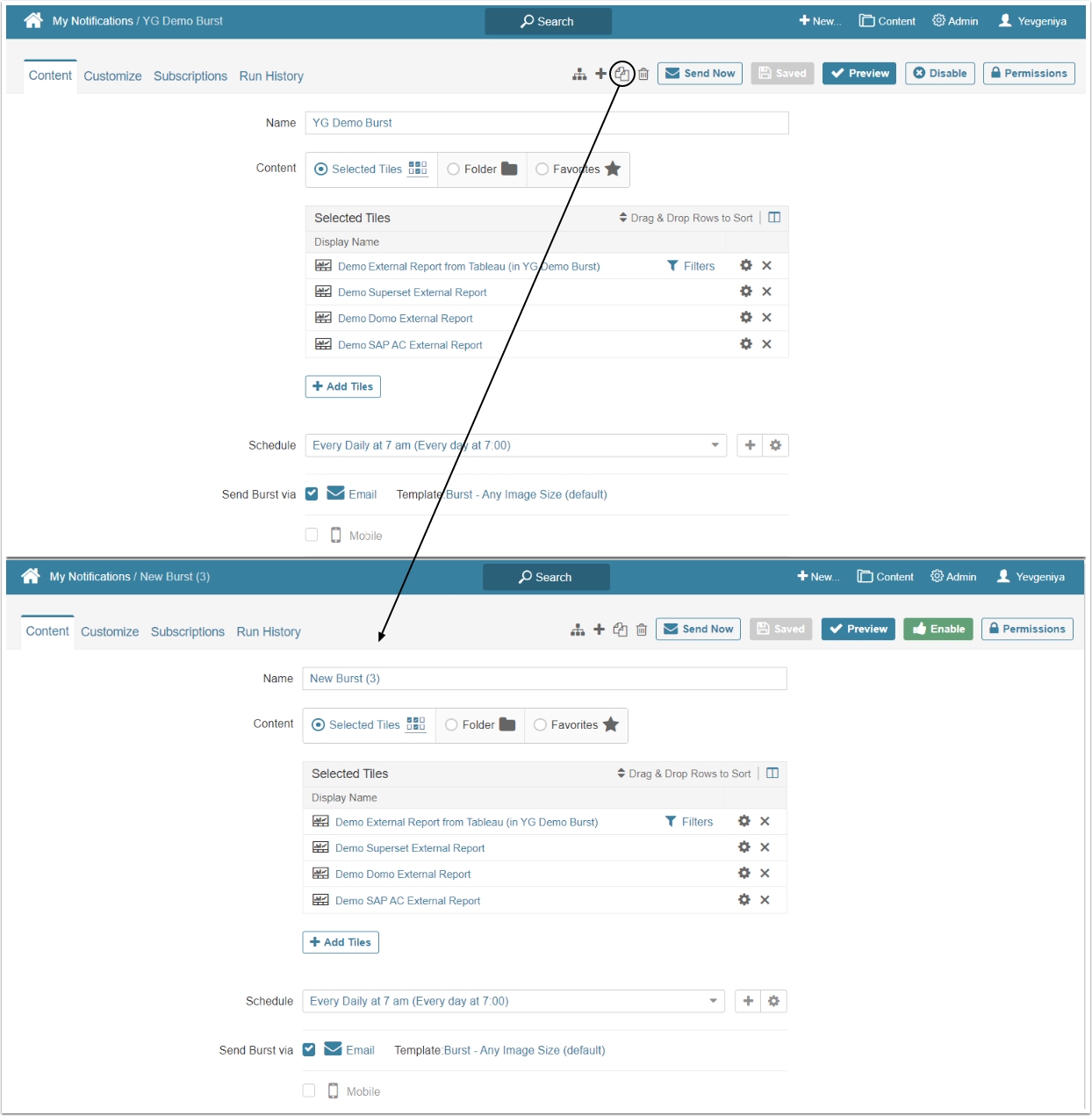 Click the duplicate icon. This will clone the Burst and create a new disabled Burst with the identical settings