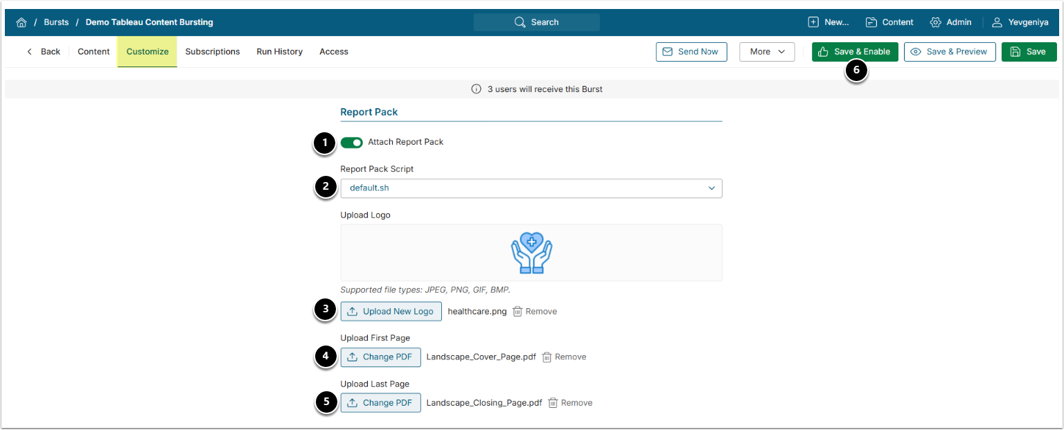 Report Packs are distributed via Bursts. They include visualizations of Elements included in the Burst. You can customize the look of the file by adding your logo (which will appear on each page at the bottom right) or by including a first or/and last page.