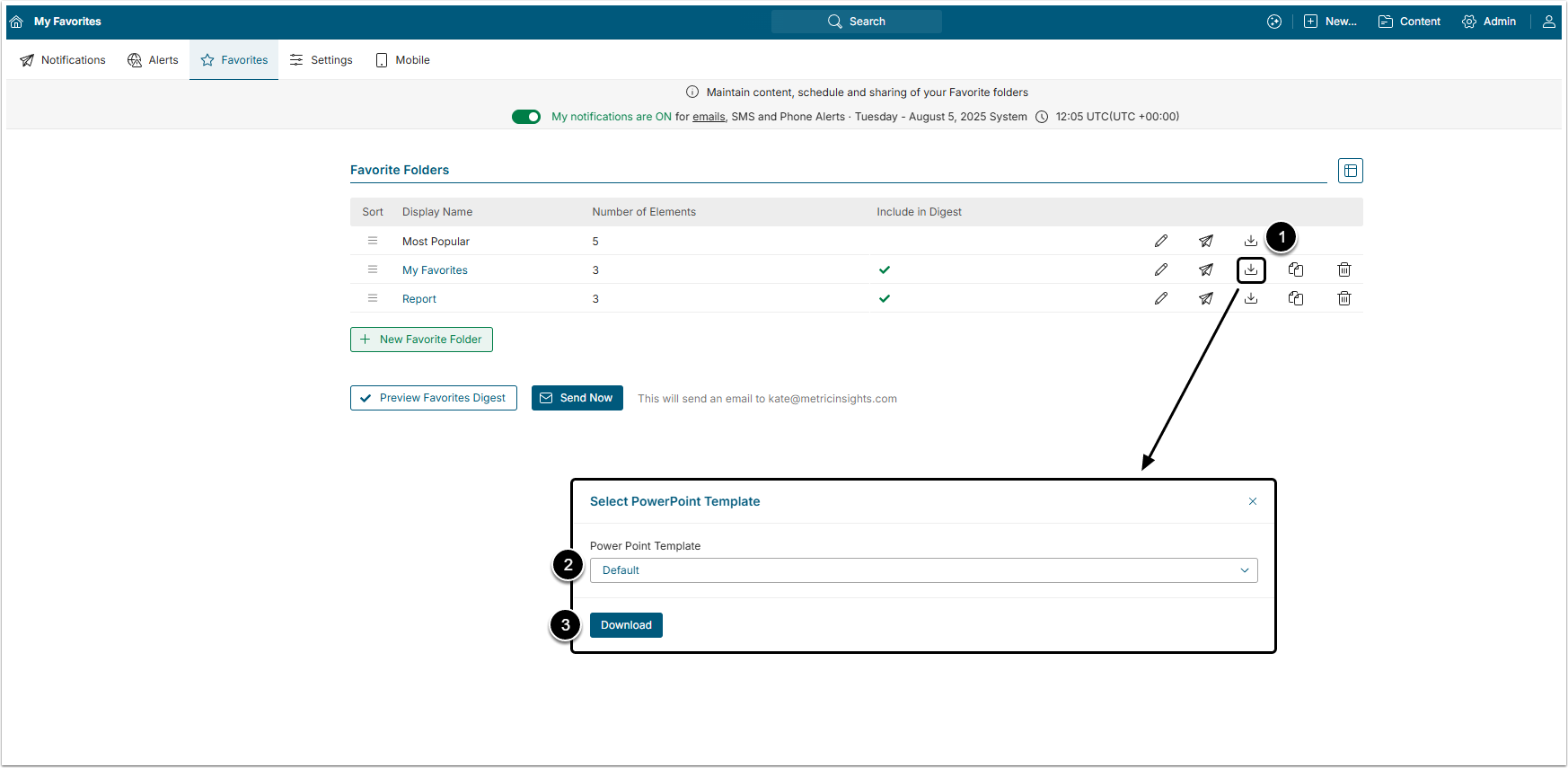 Metric Insights allows Users to create a PowerPoint Presentation of any number of Elements, added to the Favorites Folder. This article describes how to download a Favorites Folder as a PPT document.