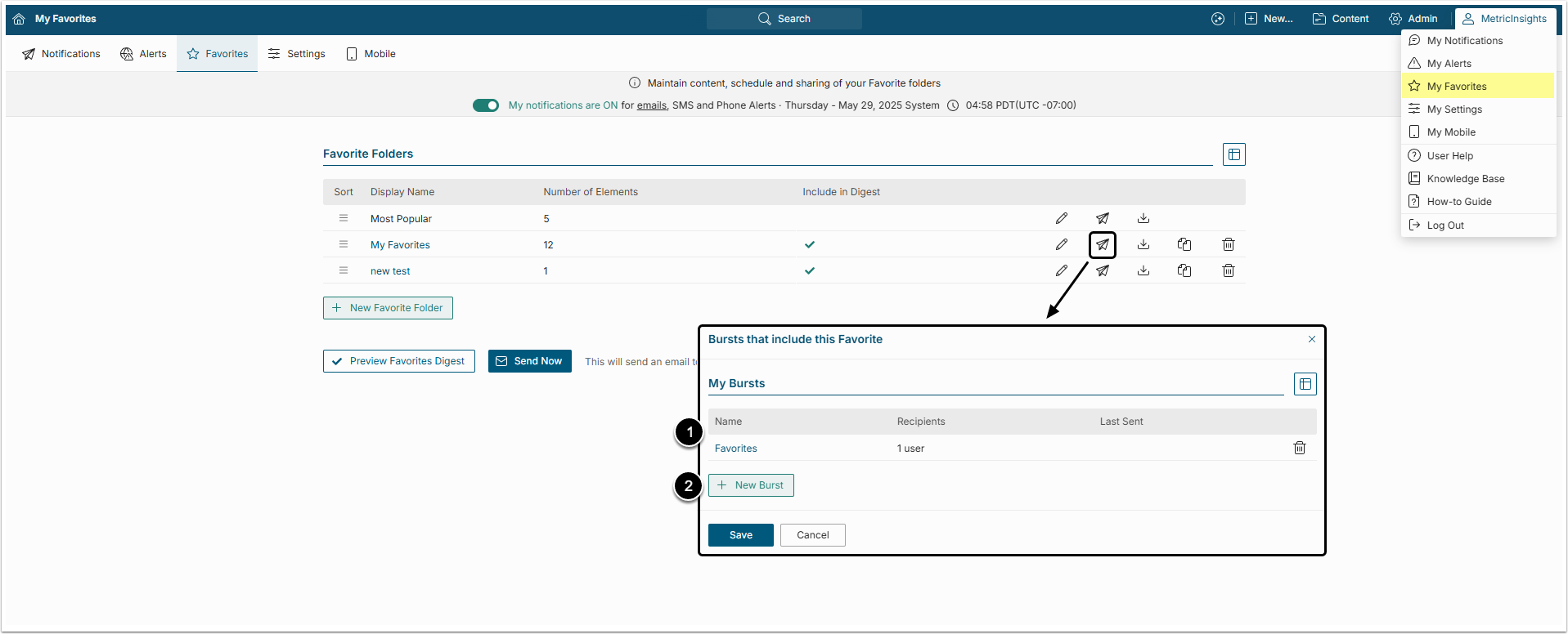 Users may configure Report Bursts directly from their Favorites Editor. This article describes how to send a Burst directly from My Favorites page.