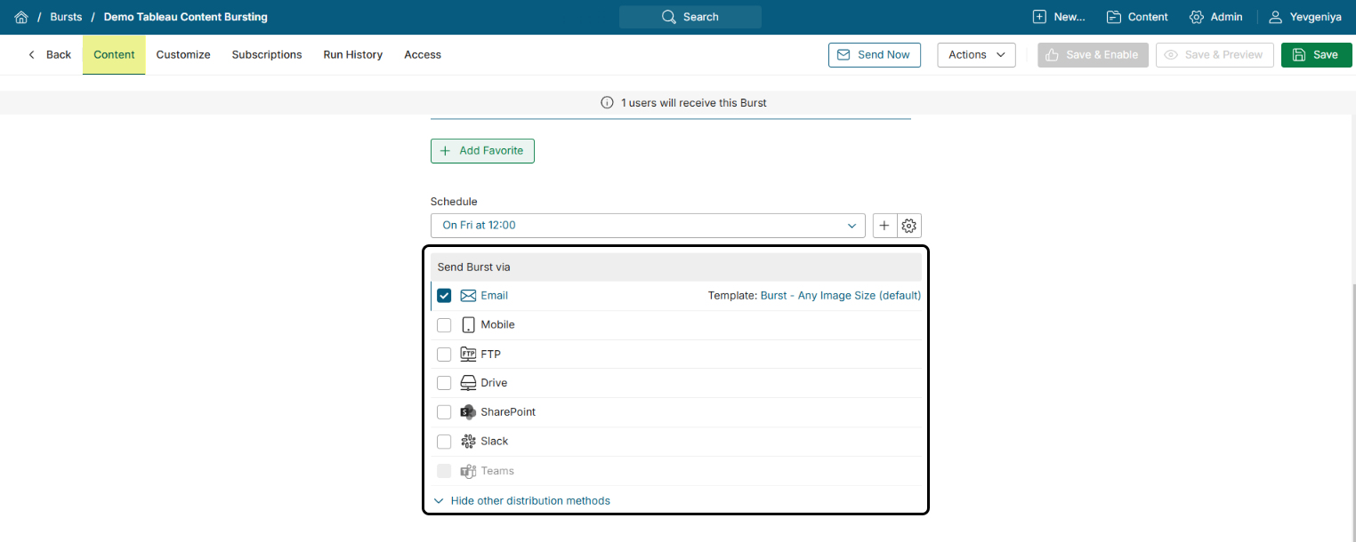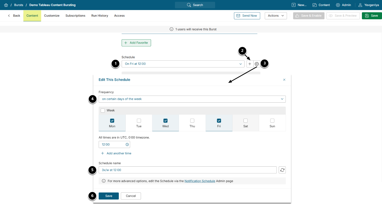 The Schedule field allows to define how frequently the Metric Insights system distributes the Burst to the Users.