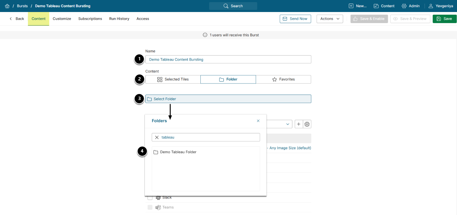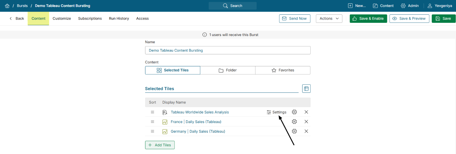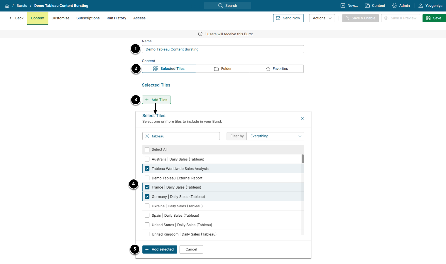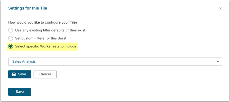 For Tableau External Reports, you can select an individual Worksheet from a Workbook to be included into the Burst.