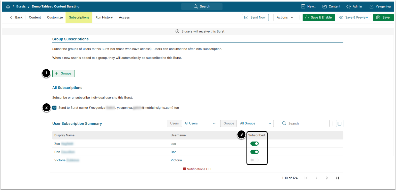 - Subscribed: To add users one by one, activate the corresponding toggle switches. You can use filters at the upper right corner above the table to find Users by Name or Group.