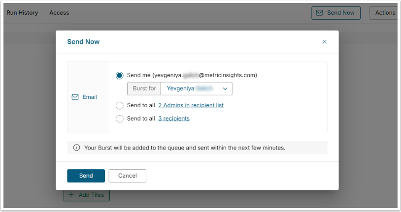 Email Subject Line: Default Subject line is "<Burst name> for <current date>", but you can enter any Subject line.- Other Email lines can also be included or updated.