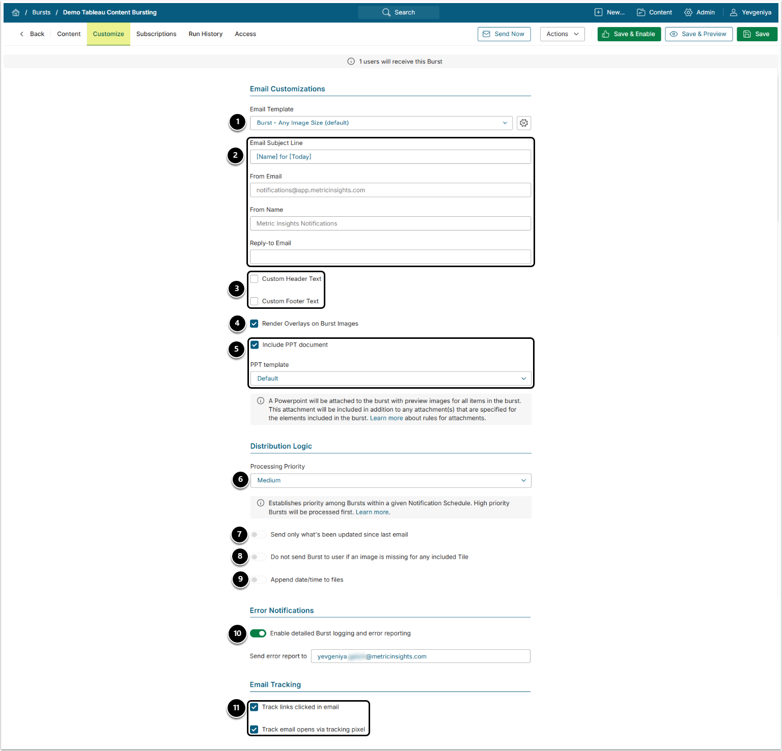 Enable detailed Burst logging and error reporting: Detailed error messaging is available. See Request Email with Errors Encountered When generating Bursts.- Selecting this options will open a field allowing input of Email address.