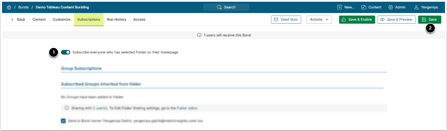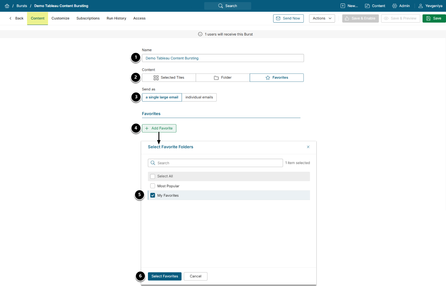 - Send as: Define whether each of the Favorite Folders that you are going to include in this Burst should be sent in "individual emails" or all of them should be sent as "a single large email".