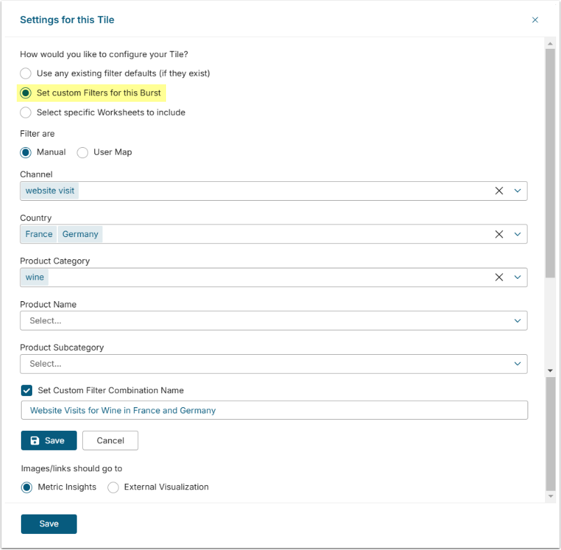 If the included External Report has Filters configured for it, you can choose custom Filters for the Burst: