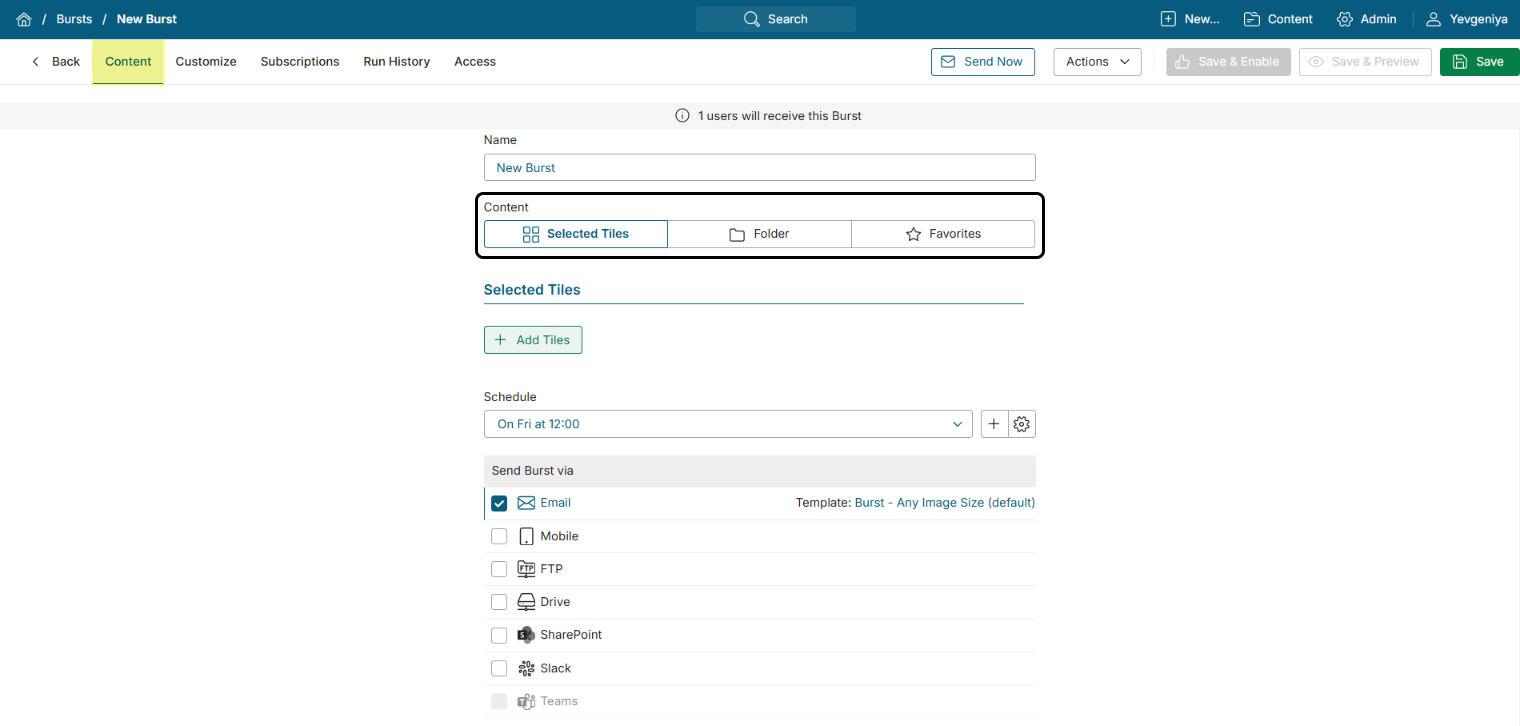 Do not send Burst to user if an image is missing for any included Tile: Prevents sending the Burst if any of the images, collected for the External Report or attached as a file for the External Content, is missing. - NOTE: This feature is available for the Email delivery only.