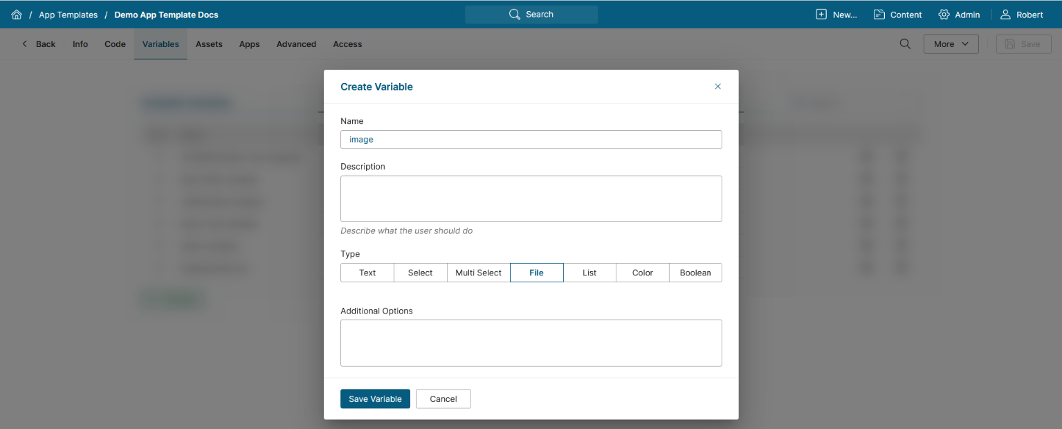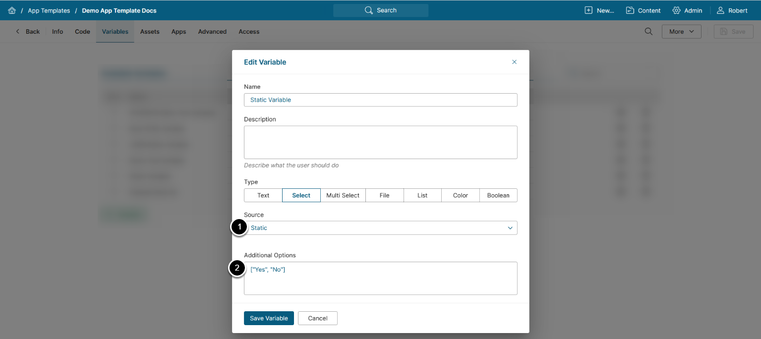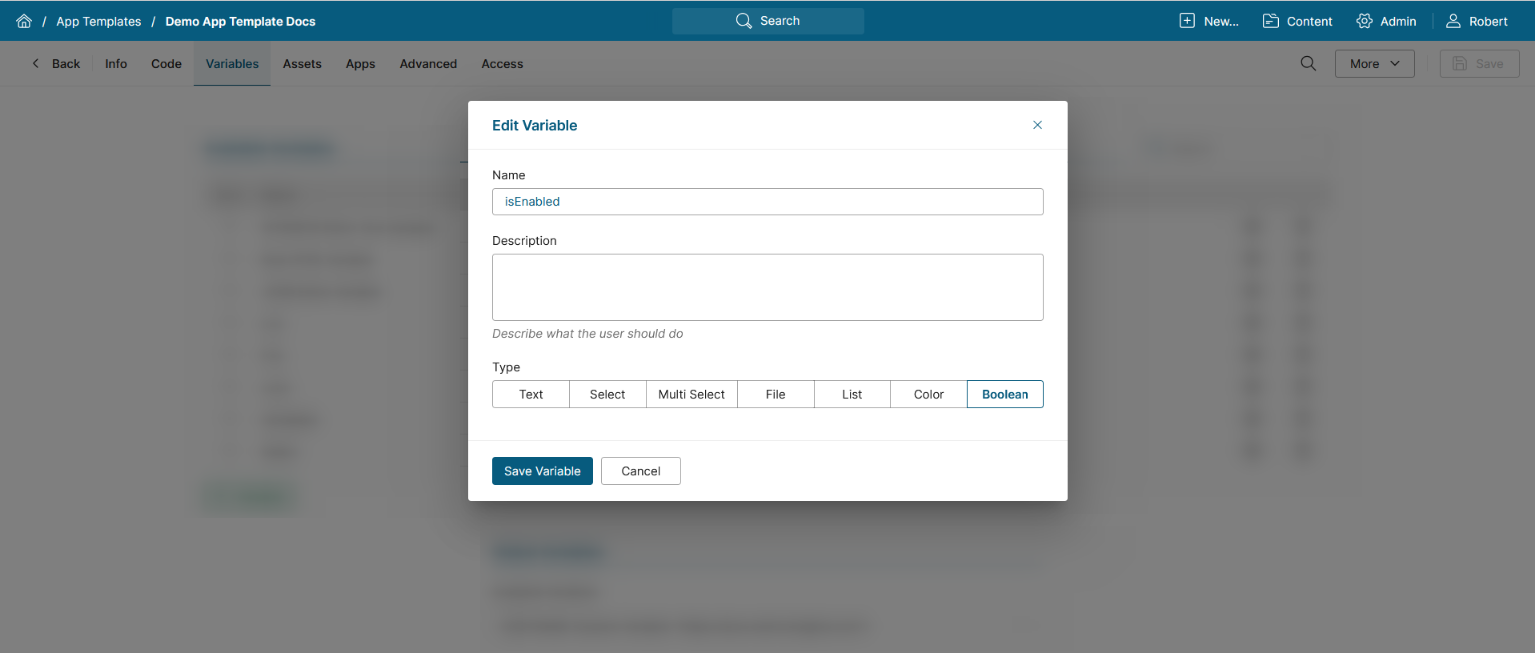- Type: Select the Variable Type from the drop-down menu. Check the Variable types description below