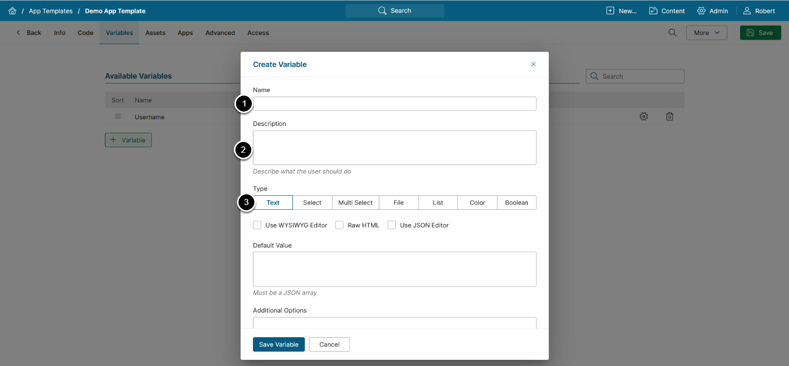 - Default Value: The text you type here will be displayed in the Variable text field and can be edited