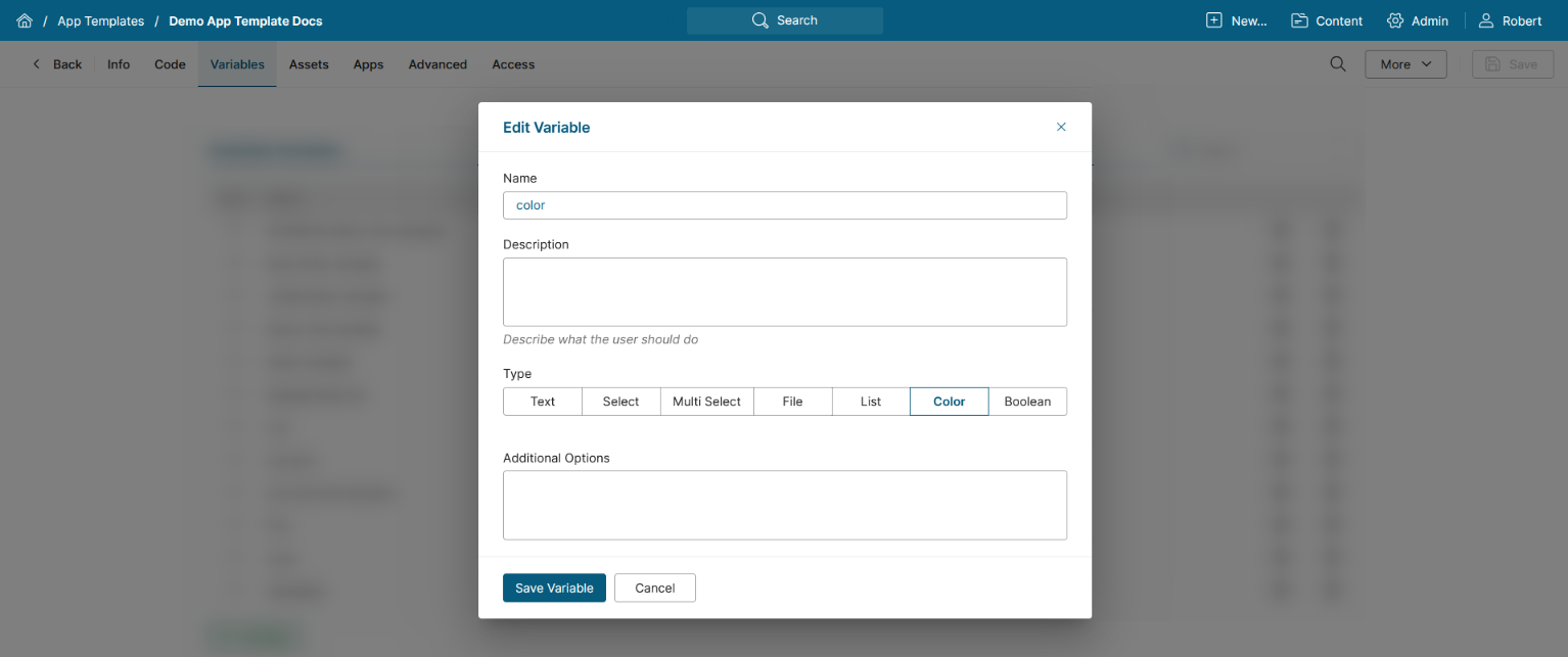 Having added Variables to a Template, Users can employ these Variables to control the content that is displayed on an App. All customer-configured Variables are shown in the App Editor (access the Editor via Content > Apps).