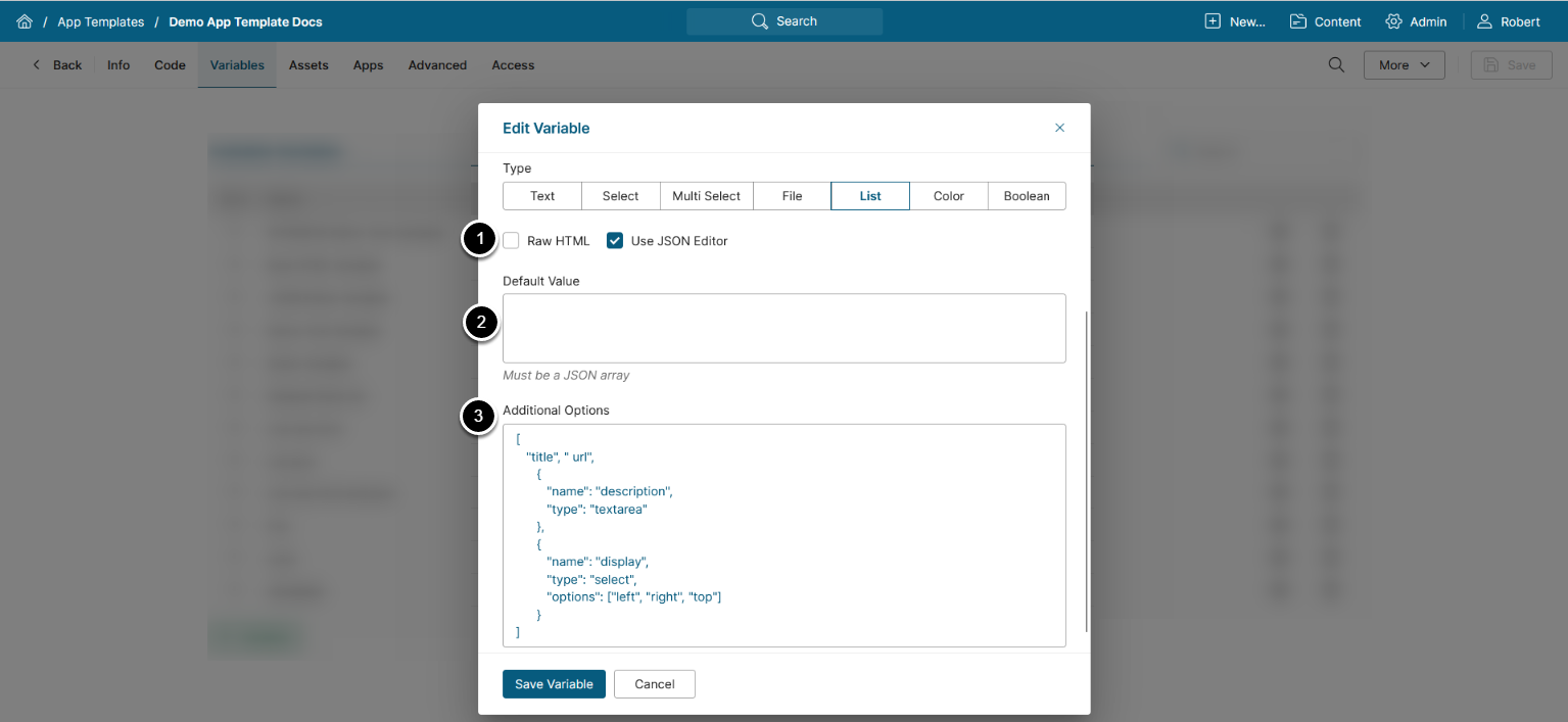 - Raw HTML: Activate this checkbox if you want to edit the Variable as raw HTML