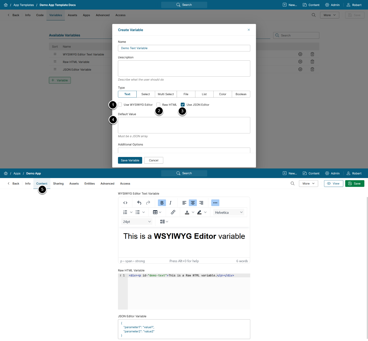 - This is an example how different Text Variables are displayed on the Content tab of the App