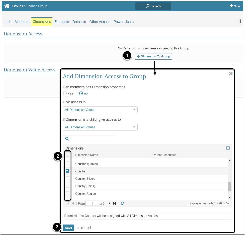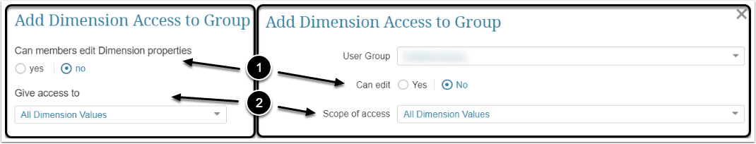 - Can members edit Dimension properties / Can edit: By setting this field to "no", you give Group members View Access only