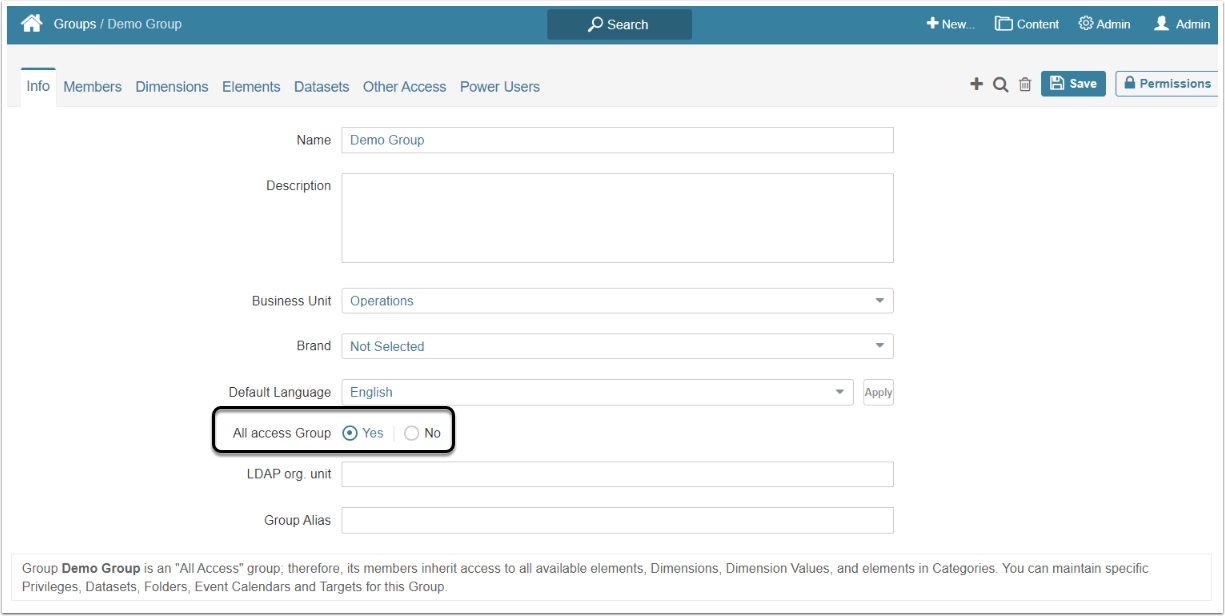 As noted in the hint text, when All Access Group is set to "Yes", the Group already has access to all Dimensions and Dimension Values. This access is VIEW access, not EDIT ACCESS. Note, however, that permission to use Data Sources is not automatically granted to All Access Group.