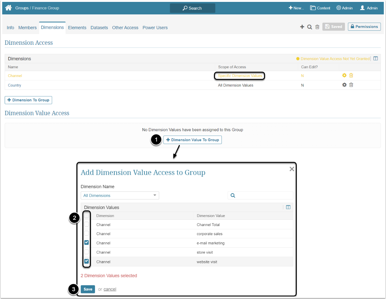 Give access to / Scope of access: Can be limited and Group Users can either see:- "All Dimension Values": This option grants the Group members access to all Dimension Values