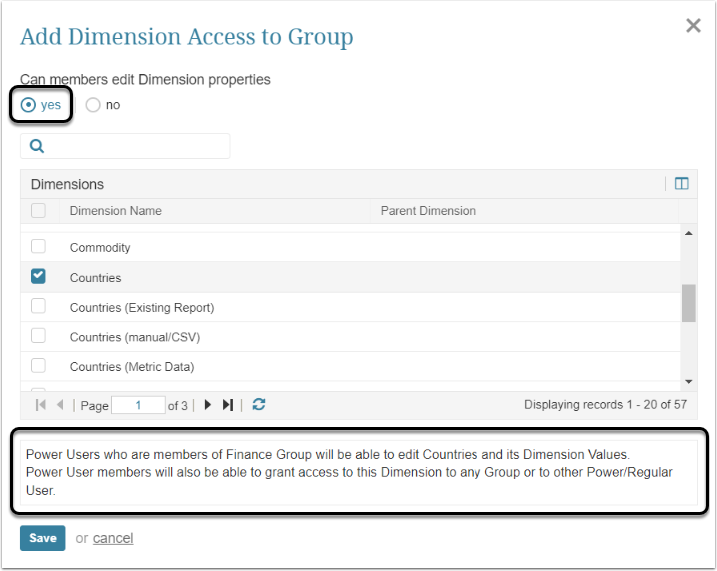 - Power Users who are members of this Group will be able to edit this Dimension and all its Values