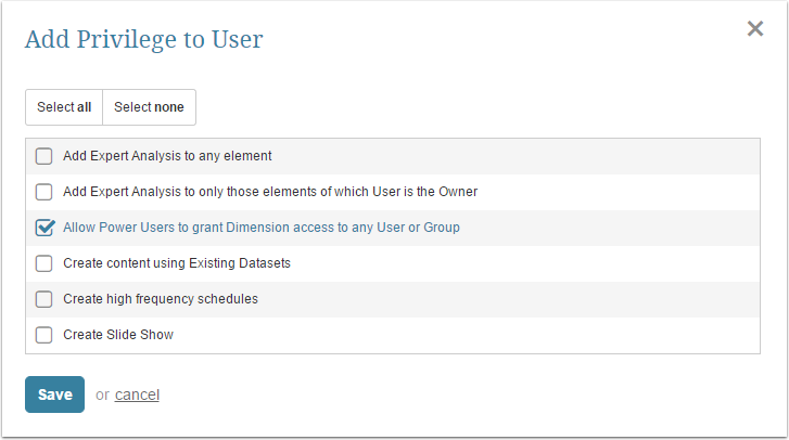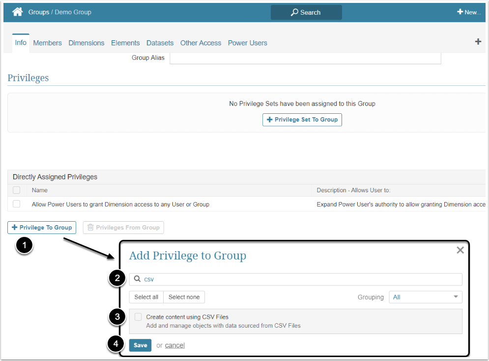 - However, the individual member Power User can directly give the Privilege to grant Dimension access to any Group or Regular/Power User. To grant this Privilege, go to Power User Editor > open the Info tab > scroll to Privileges section > [+Privilege to User] > select "Allow Power Users to grant Dimension access to any User or Group" Privilege