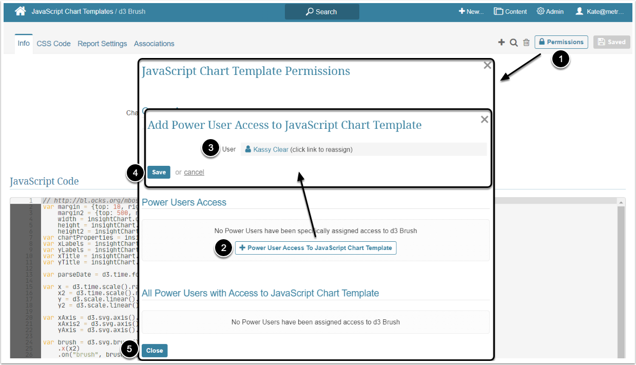 In Metric Insights, Power Users have to be granted specific Privileges and Permissions to be able to edit a JavaScript Chart Template. This article describes the steps an Administrator should take to give the Power User Edit access to a JavaScript Chart Template.