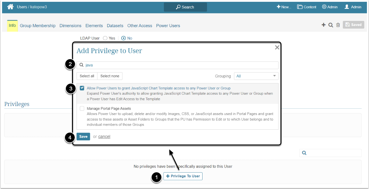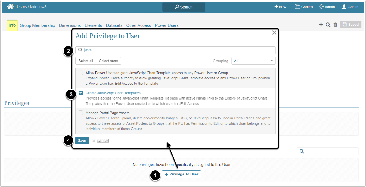 A Power User can get Edit Access to the JavaScript Chart Template individually or inherit it from the Group he/she is a member of.