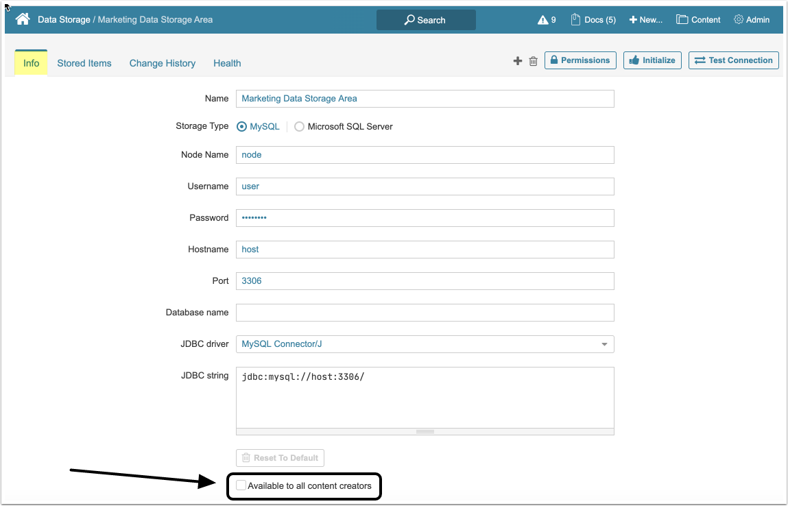 In Release 6.2.1, a new setting on the Data Storage Editor allows a Storage to be made "Available to all content creators" using a checkbox. If any Data Storage created by a User has been set to be "Available to all content creators", each Power User is automatically able to use that Data Storage for Datase creation. These Data Storage may not be individually granted to a specific Power User.