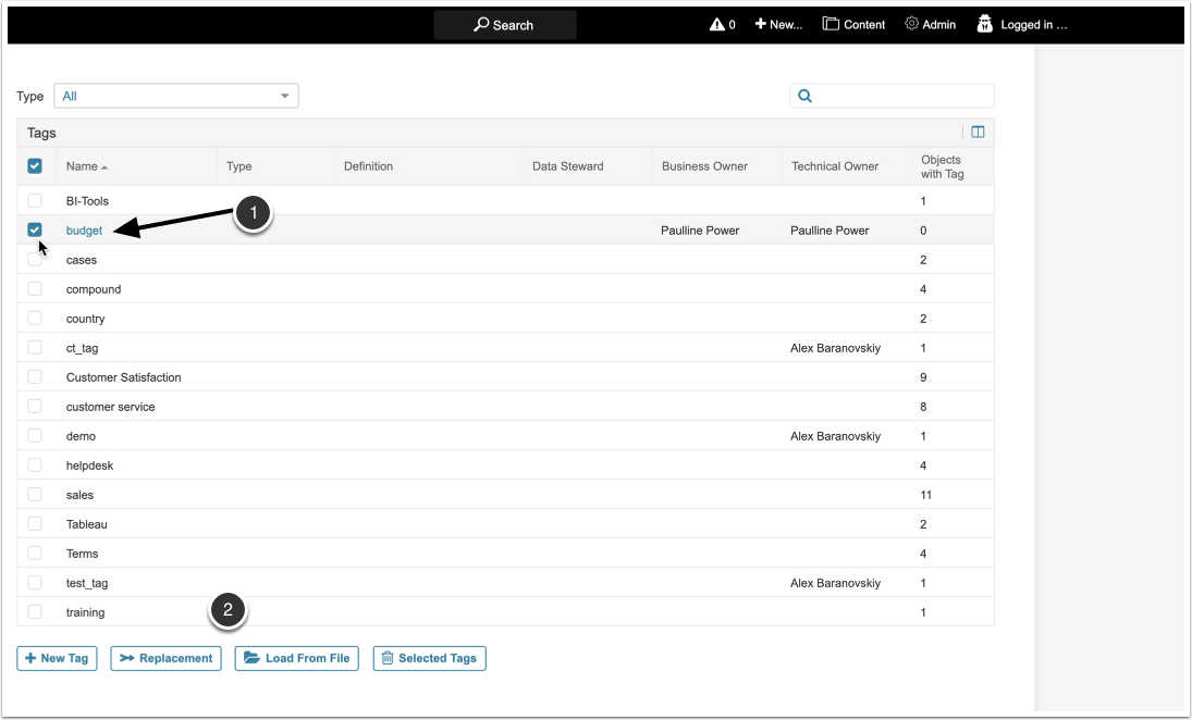 - Change whether or not a Tag that the user created is governed, select Tag Types and change the designated Business Owner, Data Scientist and Technical Owner