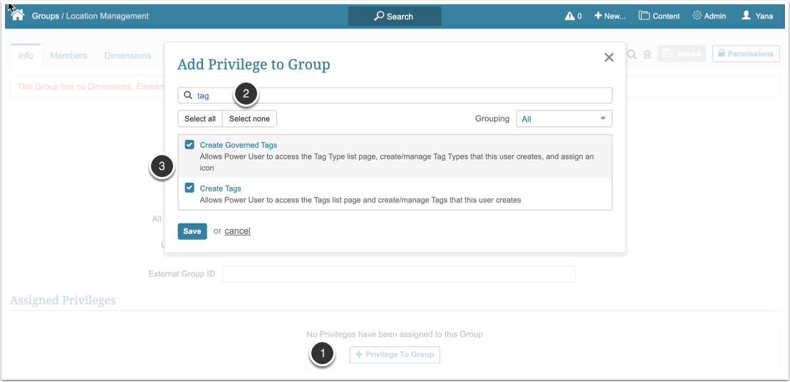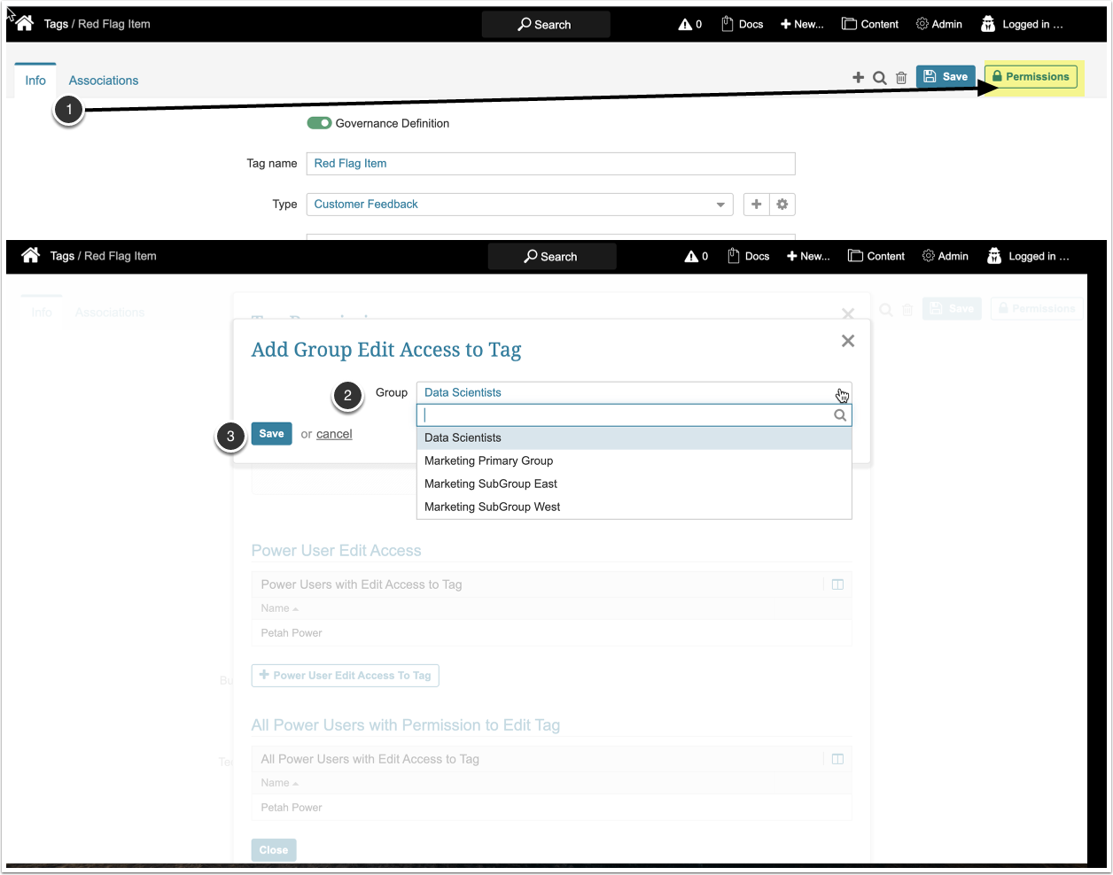 Content > Tags > Tag active Name link > Tag Editor > Permissions button > Add Group (or User) Edit Access to Tag popup