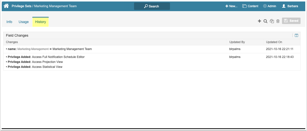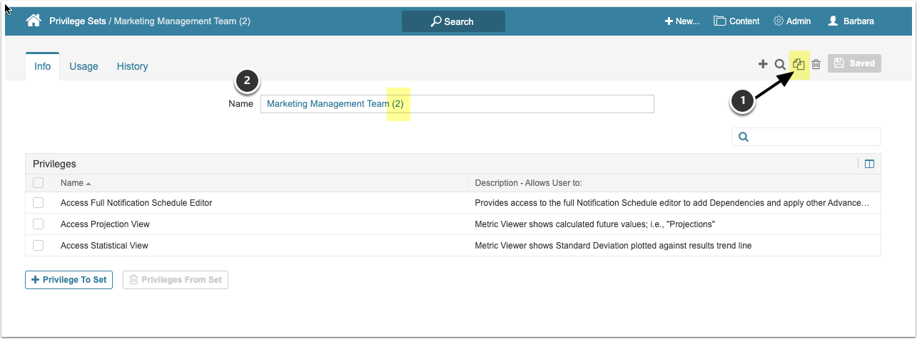 All assigned Privileges are moved to the new Set and can be updated by the Admin. All assigned Groups and Users are also copied. No History is duplicated.