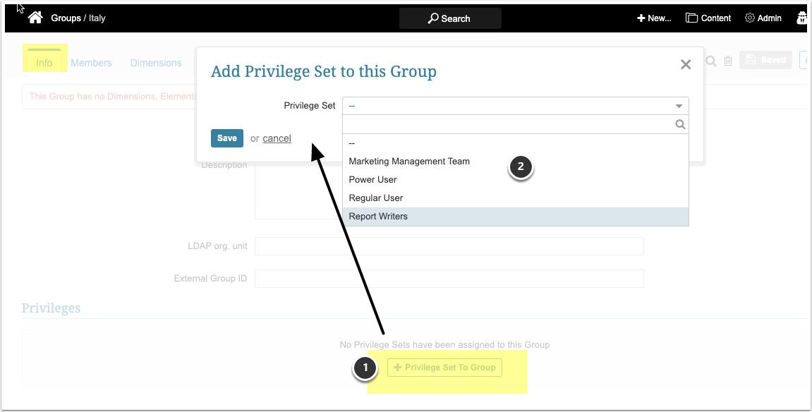 - POWER USER: Admin menu > Groups > Group Editor > Info Tab: [+ Privilege Set]