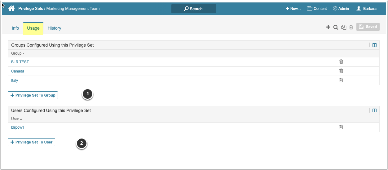 Only Admins can access the Privilege Set Editor. The Usage Tab lists all Users and Groups to which the Privilege Set has been applied.