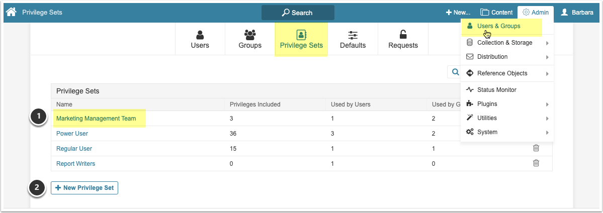 - ADMIN: Admin menu > Users & Groups > List page > Privilege Sets tab