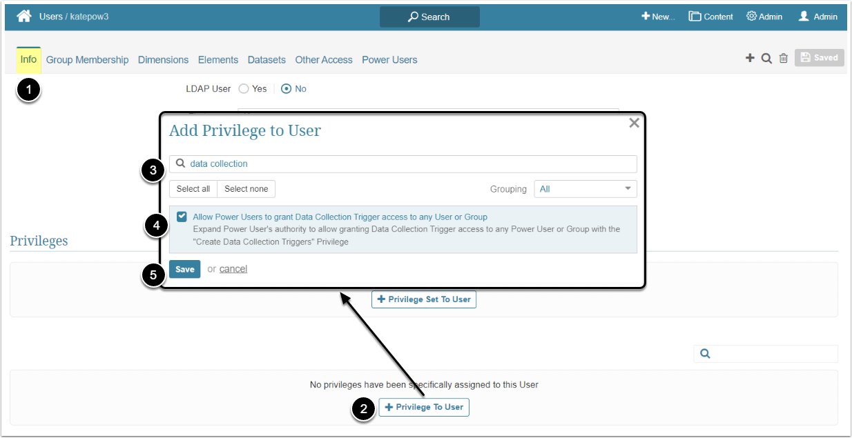 - Find the "Allow Power Users to grant Data Collection Trigger access to any User or Group" Privilege and select the checkbox