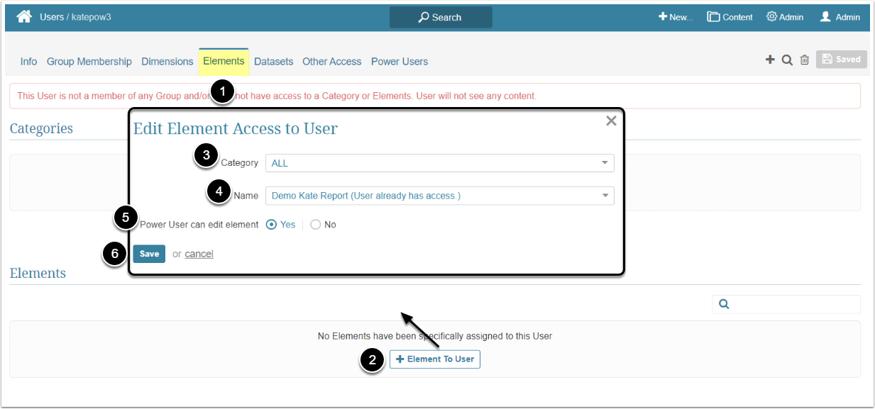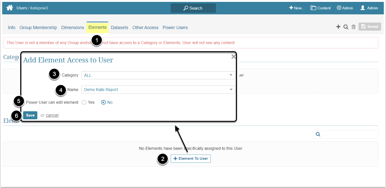 Edit Access permits a Power User to open the Report Editor, edit the Report and see the list of available Reports by opening the Elements entry of the Content menu. A Power User can grant access to the Dataset Report to Power Users who are members of the same Group or the ones the PU has edit access to.