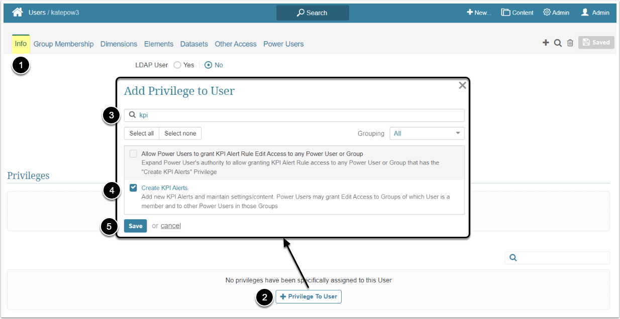 - Find the "Create KPI Alerts" Privilege and select the checkbox