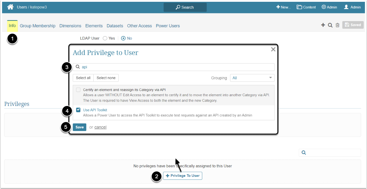 A Power User can get access to an API Toolkit individually or inherit it from the Group he/she is a member of. For more details about granting Access to the Group, check the Assigning Privileges and Permissions to the Group article.