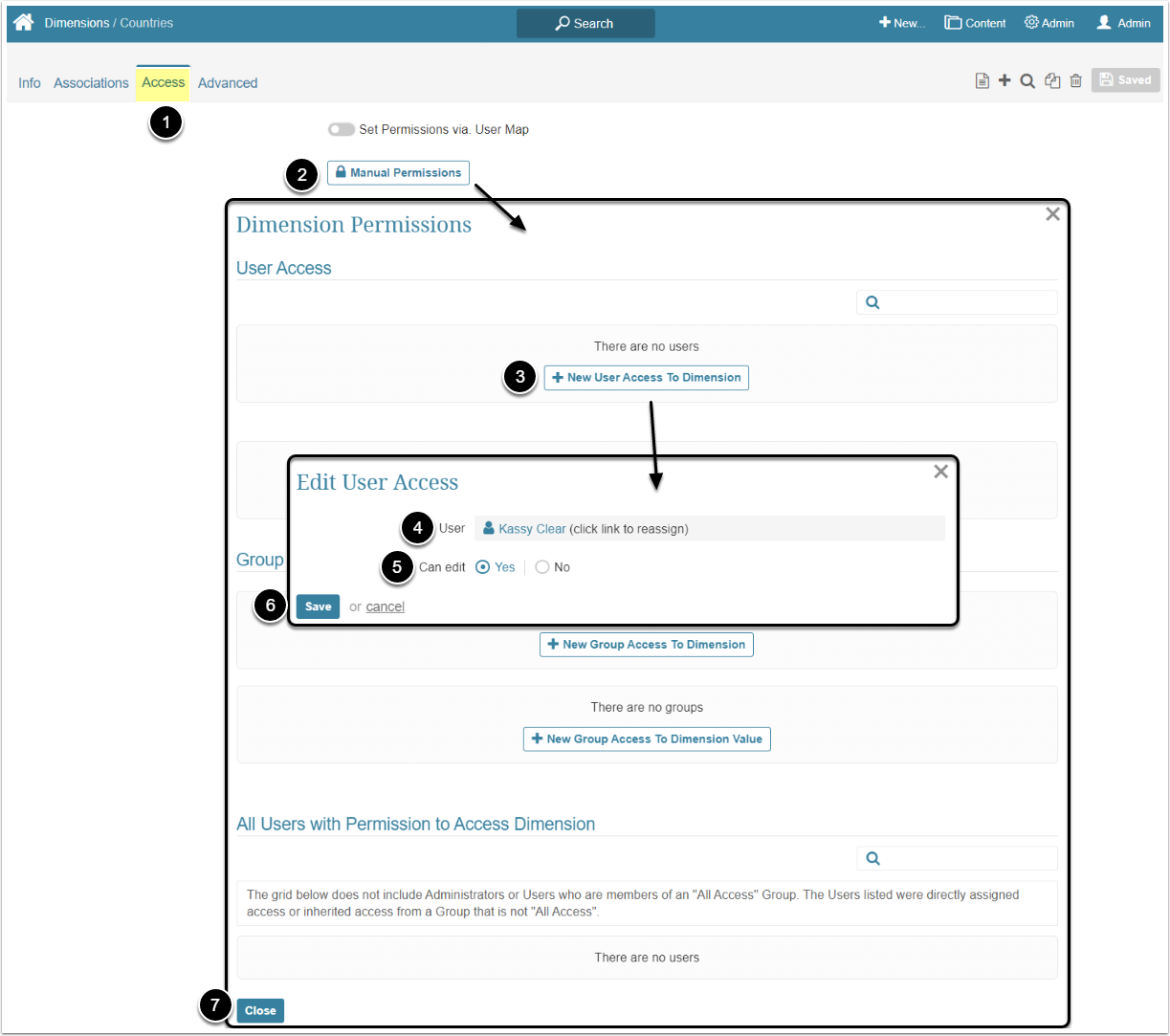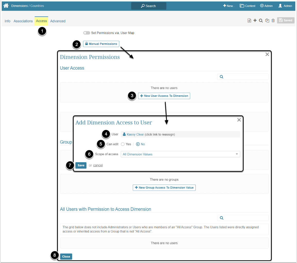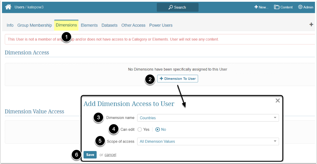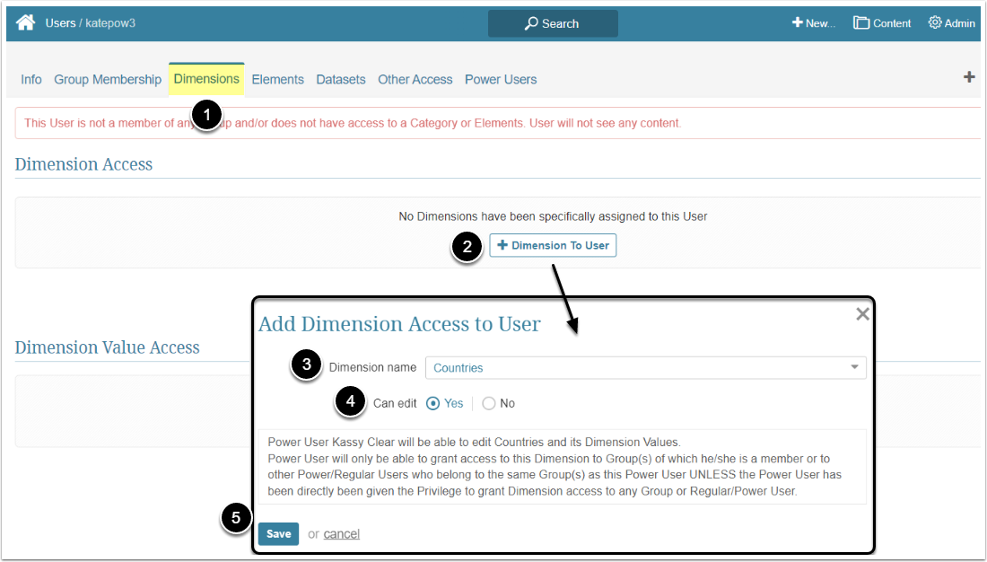 Edit Access permits a Power User to open the Dimension Editor, edit the Dimension and see the Dimension in the Dimensions list that is available by opening the Dimensions entry in the Content menu. With Edit Access to the Dimension, the Power User receives Edit Access to all its Dimension Values.