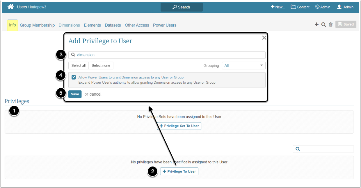 - Find the "Allow Power Users to grant Dimension access to any User or Group" Privilege and select the checkbox