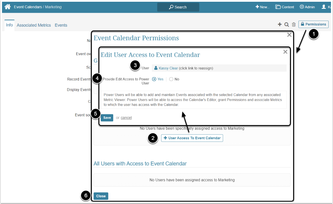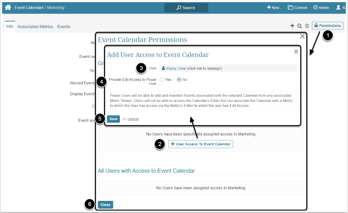 Use Access can be granted to both Regular and Power Users and only applies to Event Calendars sourced manually. It allows the User with Permission to manage the Calendar's Events from an associated Element's Viewer. Users will not be able to access the Calendar's Editor but can associate the Calendar with a Metric to which the User has Edit Access to via the Metric's Editor.
