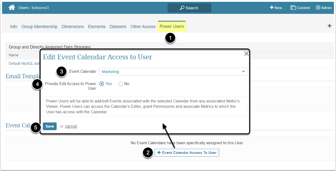 In Metric Insights, Power and Regular Users have to be granted specific Privileges and Permissions to be able to use and edit an Event Calendar. This article describes the steps an Administrator should take to give the User Use and Edit access to an Event Calendar.
