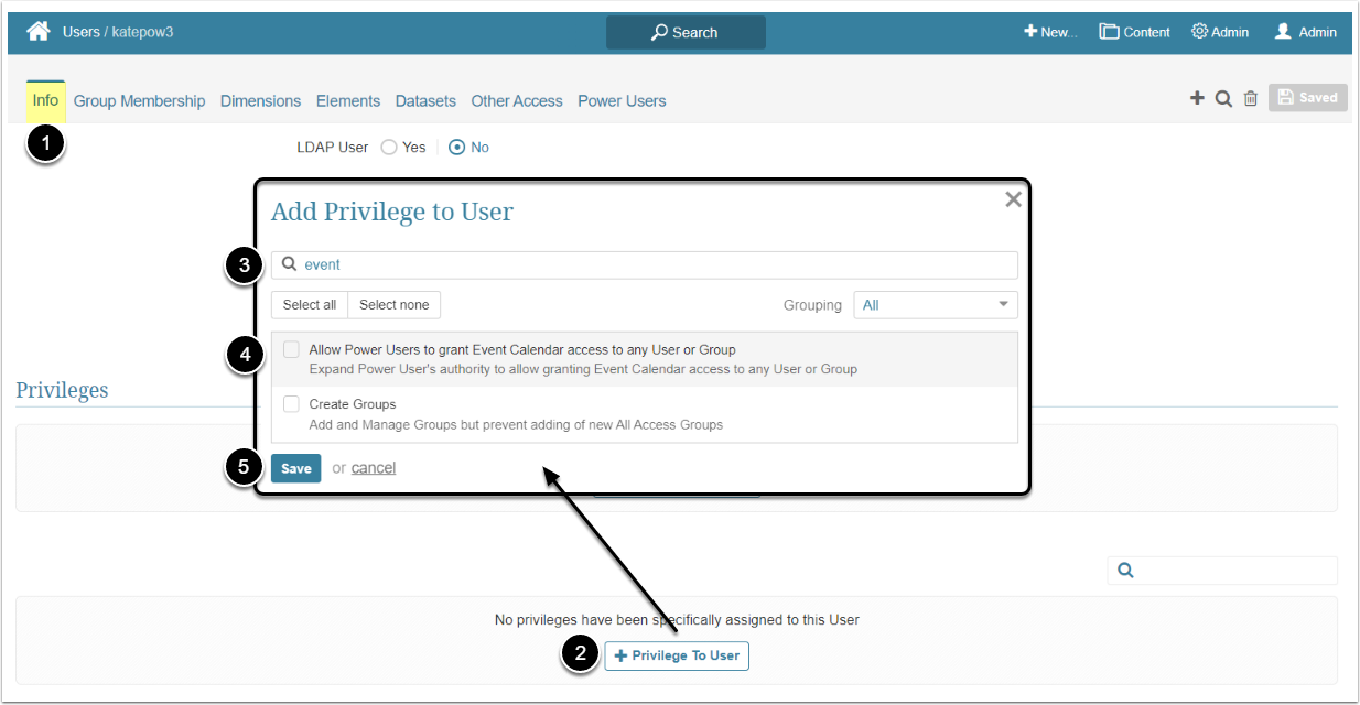 - Find the "Allow Power Users to grant Event Calendar access to any User or Group" Privilege and select the checkbox