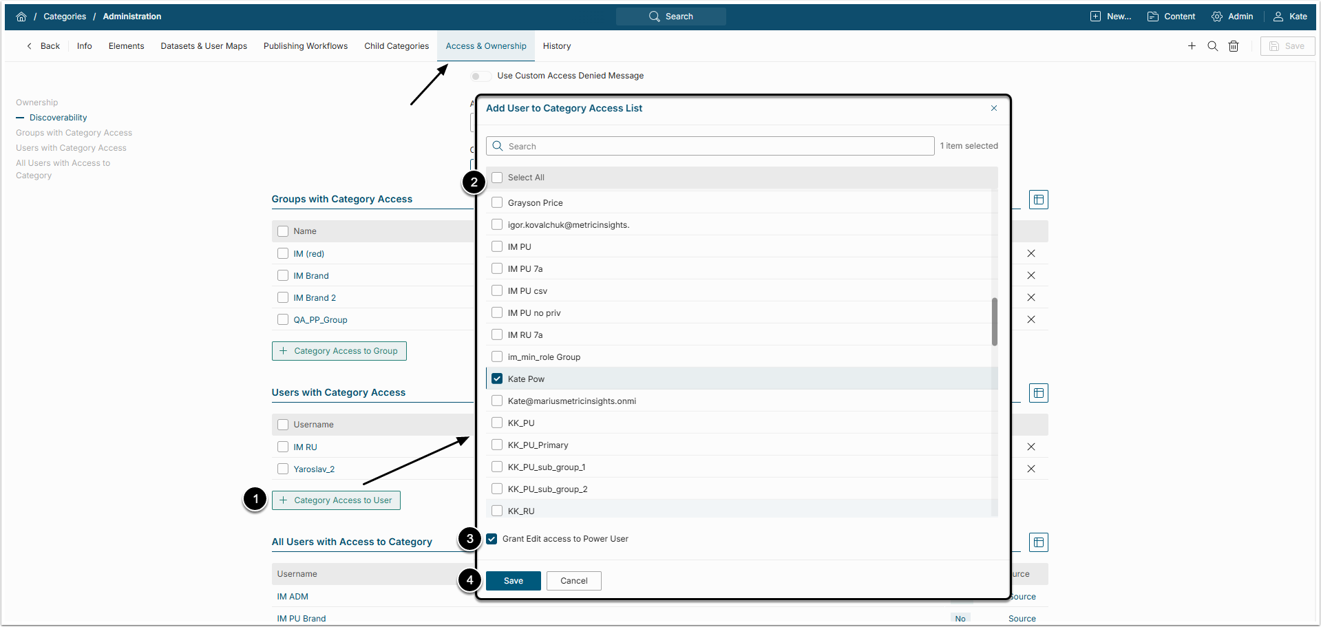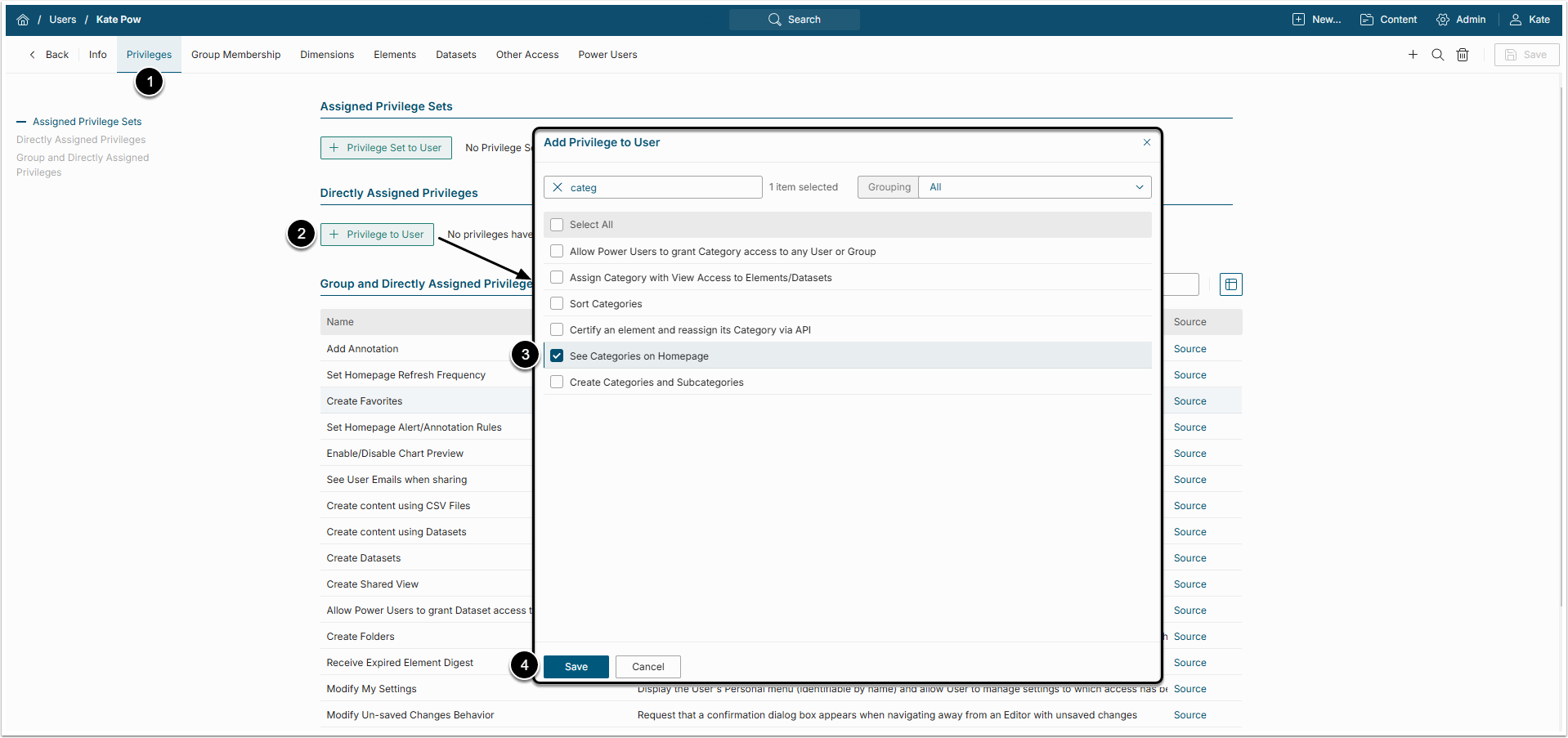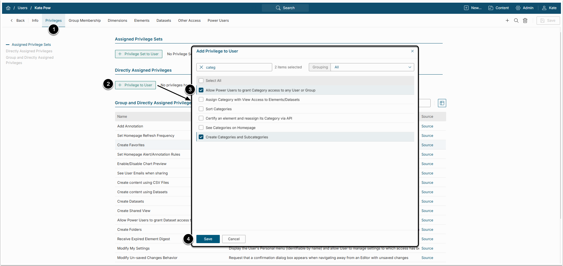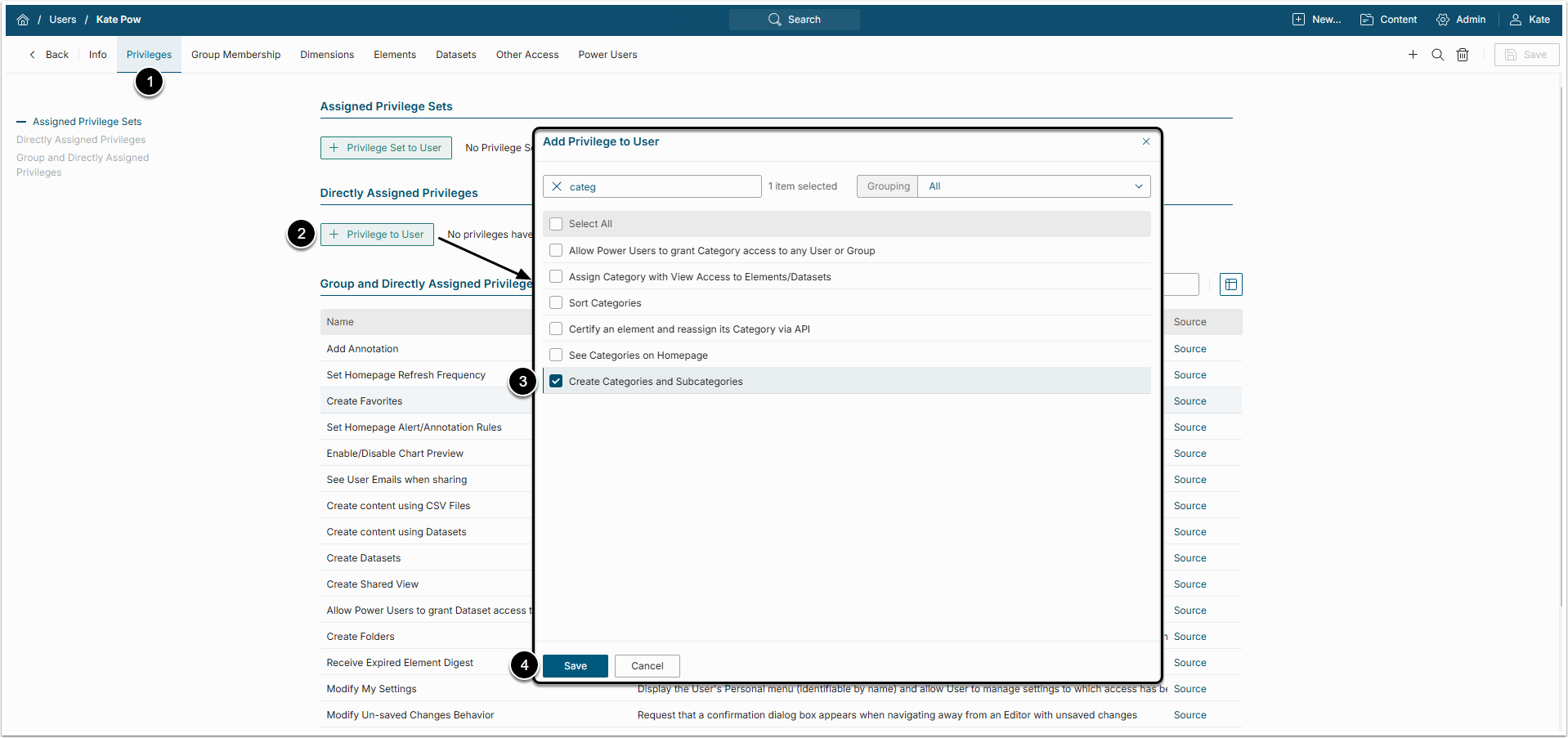 A Power User can have access to a specific Element or Dataset that is a part of the Category, but that doesn't give him access to the Category itself. To be able to view or edit a Category, the Power User needs specific Privileges and Permissions. This article describes what steps should an Admin take to grant the Power User View and Edit Access to a Category.