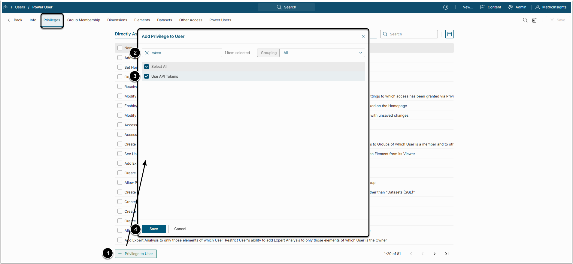 In Metric Insights, Power Users have to be granted a specific Privilege to be able to create API Tokens. This article describes the steps an Administrator should take to give the Power User Use access to API Tokens.